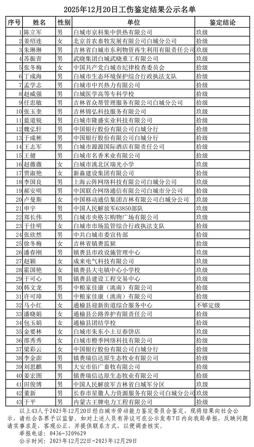 2025年12月20日工伤鉴定结果公示名单