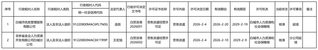 设立劳务派遣单位及其业务范围审批公示信息(2026年2月2日至2月6日办理)