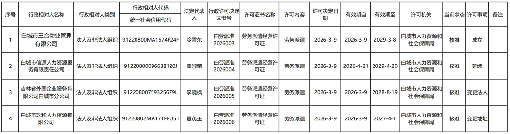 设立劳务派遣单位及其业务范围审批公示信息(2026年3月9日至3月13日办理)