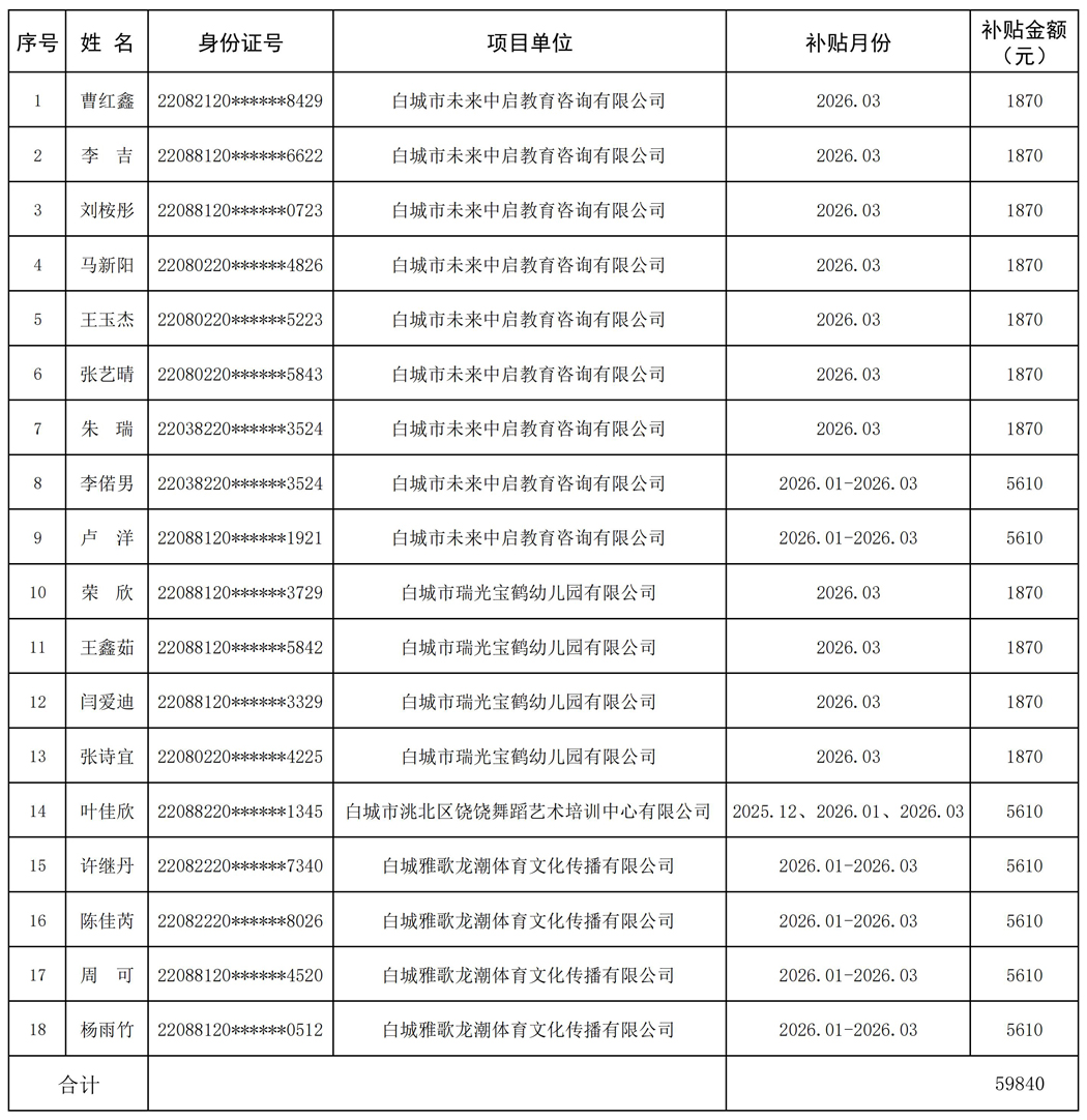 按照《吉林省校企合作助理项目工作方案》 (吉人社联〔2025〕87号)文件精神,经审核考勤及项目岗位工作完成情况,现对市本级拟发放2026年3月校企合作助理项目补贴(共计18人,资金5.9840万元)予以公示,接受社会监督。公示期间,如有异议,请在公示期内与我们联系。