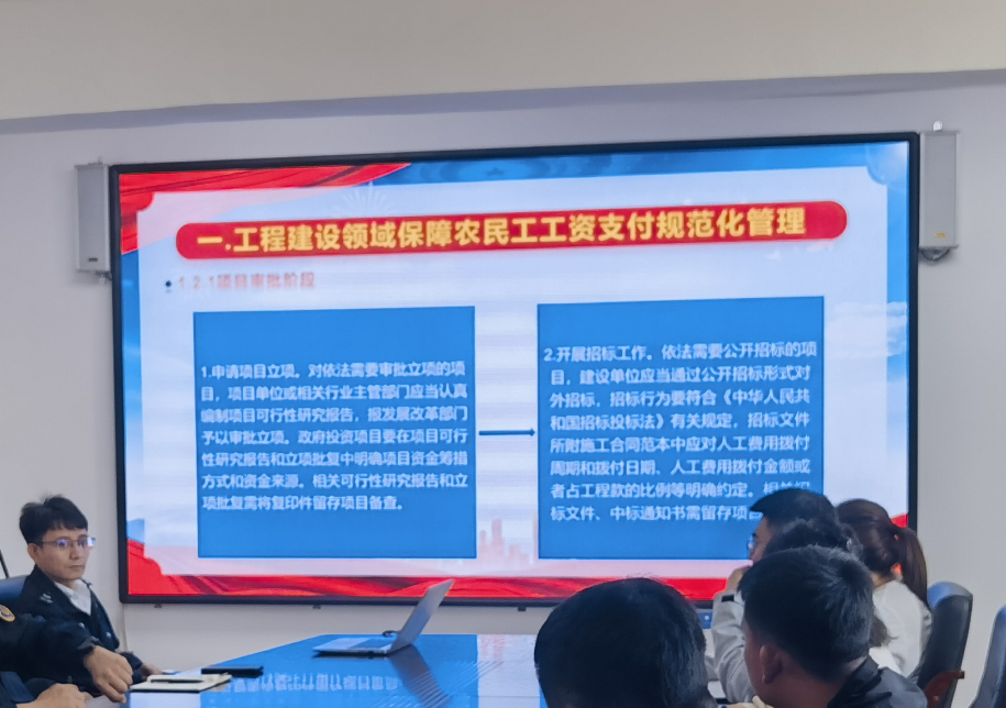 培训会上,执法监察科负责人重点围绕工程建设领域保障农民工工资支付规范化管理相关要求进行了专题培训,并对《保障农民工工资支付条例》《吉林省拒不支付劳动报酬案件移送和查处工作实施办法》进行政策解读。市住建局建管科负责人强调工程款支付担保和现场人员实名制注意事项,督促施工总承包公司负责完善项目资料信息、实名制平台考勤录入标准、劳动者欠薪风险防范等工作。省执法监察信息化监管平台工作人员和监察员组织开展现场问卷调查,为参会人员答疑解惑。